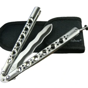 Total längd: 252 mm (9,92 tum) Bladlängd: 115 mm (4,52 tum) Handtagslängd: 137 mm (5,39 tum) Bladtjocklek: 3 mm (0,118 tum) Bladbredd: 21 mm (0,82 tum) Handtagstjocklek: 13 mm (0,51 tum) Hårdhet: 56-58HRC Bladmaterial: 440 Handtagsmaterial: Aviation aluminium 6061-T6 Nettovikt: 105gV4 Butterfly 6061 Aluminium Bright Slot Training Balisong Knife