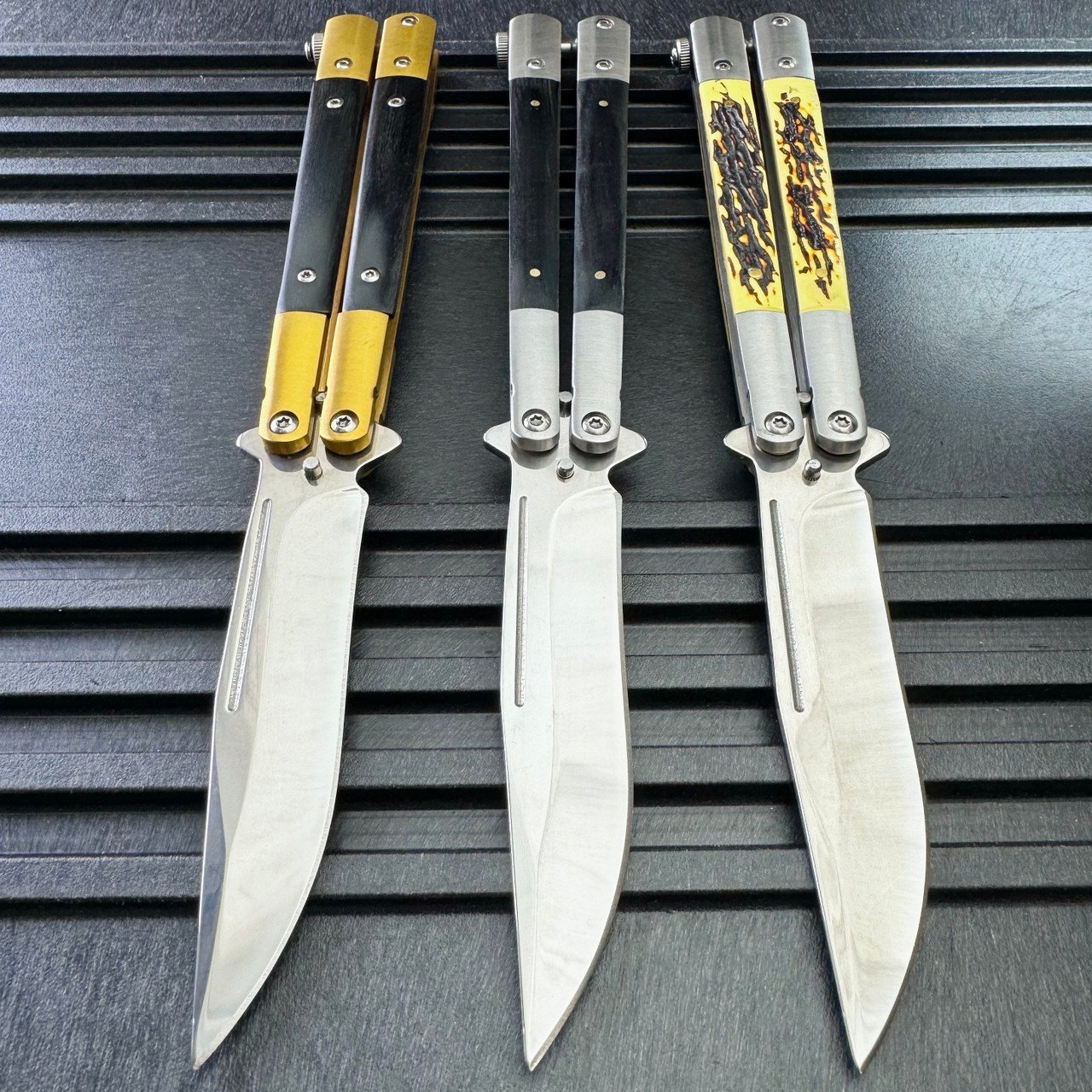 Denna fjärilskniv kommer med aluminiumhandtag som inkluderar en vacker trä- eller staginsats. Bladet är en clip point-stil konstruerad av 440C rostfritt stål som är hållbart och inte rostar så att denna knivs livslängd garanteras. Den är också utrustad med ett lås kopplat till basen av det vänstra handtaget. Stäng helt enkelt kniven och skjut in låset i det högra handtaget så förblir kniven stängd.