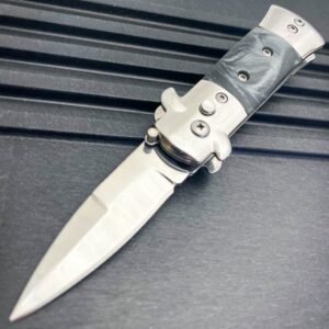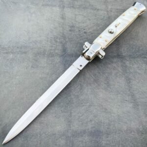 Den italienska stiletten är en av de mest ikoniska knivarna i historien på grund av sin långa historia och beprövade stil. Denna stilett har en integrerad vertikal glidsäkerhet, tryckknappsoperativsystem, och bladet frigörs genom att trycka det främre vingskyddet från höger till vänster (Se foton). Vacker fickkniv med bolster i rostfritt stål, ett enkantigt blad i bajonettstil.