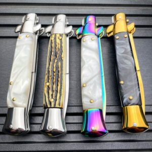 Den italienska stiletten är en av de mest ikoniska knivarna i historien på grund av sin långa historia och beprövade stil. Denna stilett har en integrerad vertikal glidsäkerhet, tryckknappsoperativsystem, och bladet frigörs genom att trycka det främre vingskyddet från höger till vänster (Se foton). Vacker fickkniv med bolster i rostfritt stål, ett enkantigt blad i bajonettstil.