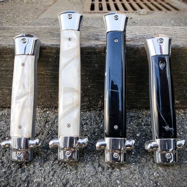 Det råder ingen tvekan om att den automatiska OTF-kniven med marmorerad stilett kommer att göra ett djärvt uttalande och kommer in på 9″ eller 11″ i total längd. Stilettkniven har ett spegelpolerat, 3 3/4″ blad i rostfritt stål med ett knivskarpt blad kant och en penetrerande punkt. Bladet snäpper ut ur knivens framsida när glidavtryckaren trycks framåt och dras tillbaka när den dras bakåt. Den 4″ eller 5″ stängda fickkniven har klassiska handtagsvågar, och glidavtryckaren är bekvämt ligger på toppen. Den imponerande stilettfickan kan bäras säkert i en nylonbälteshylsa med en snabbspänne.