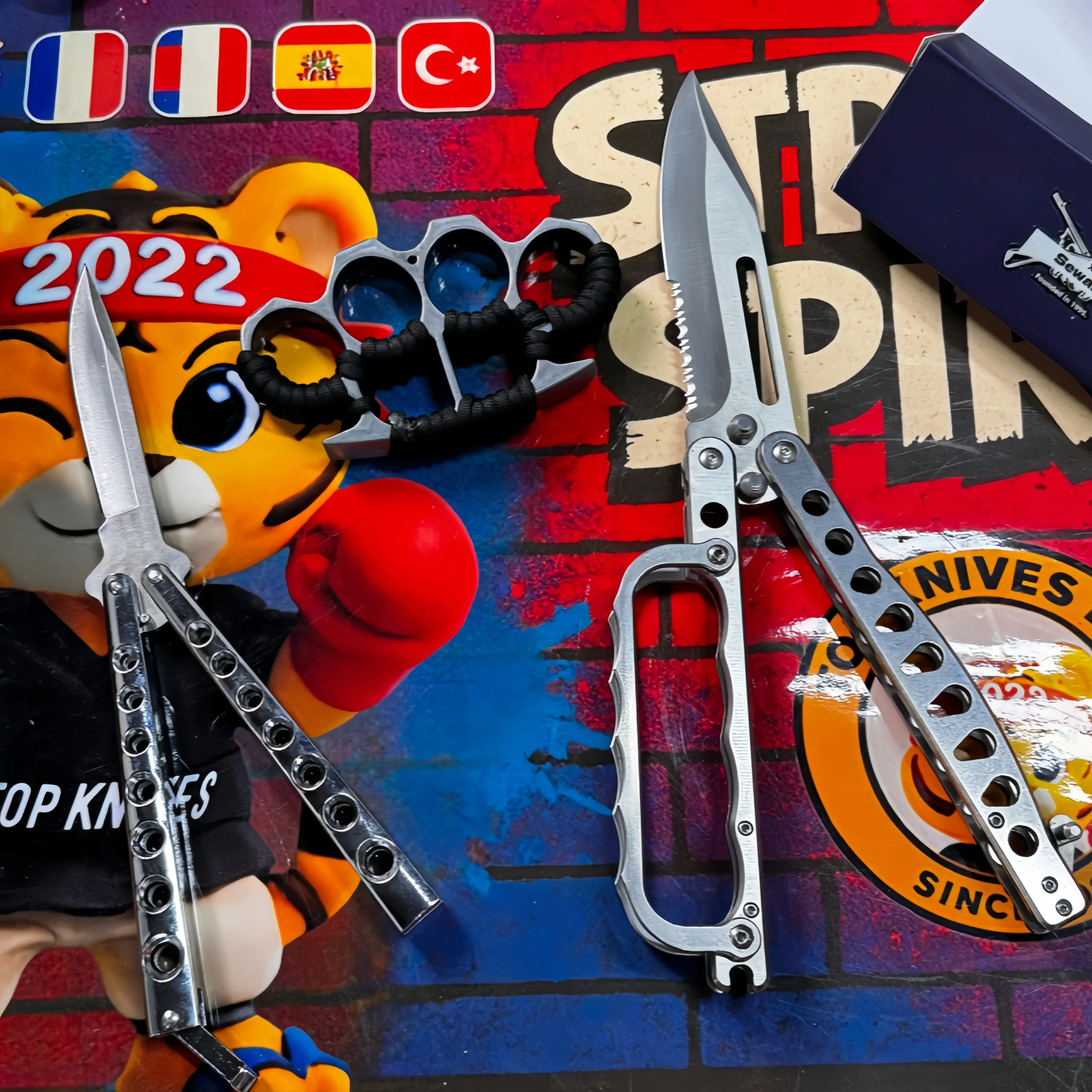 A brass knuckle butterfly knife